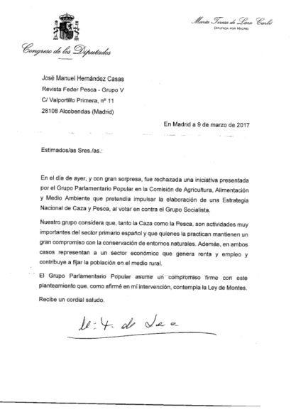 La diputada por Madrid del Partido Popular, Doña María Teresa de Lara Carbó, nos acaba de enviar por correo una carta (de la que adjuntamos imagen del PDF) con el rechazo por parte del Partido Socialista Obrero Español a la iniciativa presentada por el Grupo Parlamentario Popular (de la cual también adjuntamos imagen del PDF) en la Comisión de Agricultura, Alimentación y Medio Ambiente que pretendía impulsar la elaboración de una Estrategia Nacional de Caza y Pesca.